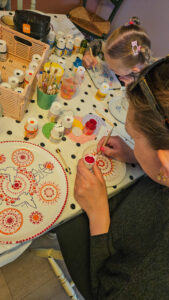 Jullie kiezen allebei een wit porseleinen bordje uit. Op een rustige manier leg ik uit hoe het is om met porseleinverf te werken. Je hebt geen schildertalent nodig! Met speciale houten stipstokjes en professionele porseleinverf leer je hoe je perfecte, ronde stippen zet. Je mag helemaal zelf weten wat je gaat maken! Tijdens de uitleg laat ik jullie zien hoe je mooi rond mandala-patroon stipt, maar je kunt ook kiezen voor een eigen illustratie.